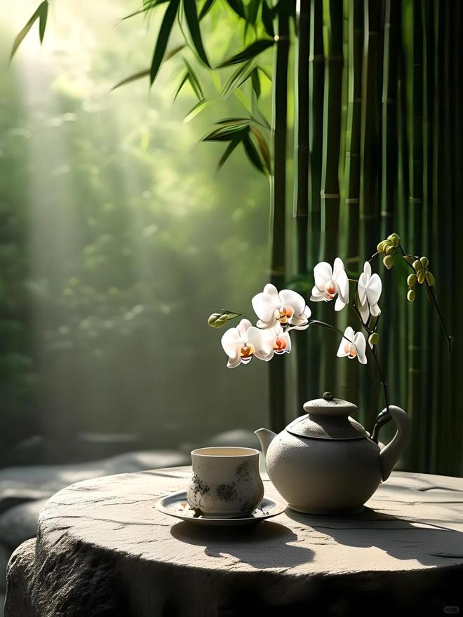 在翠绿的竹林之下,我们相对无言,只以一杯紫茶传递着彼此的情谊。这份宁静与淡泊,远远胜过那些追求仙道、醉卧流霞的羽客。